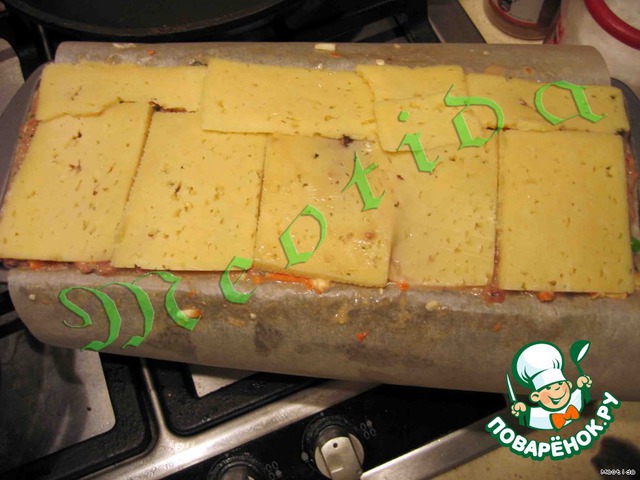 Российский сыр порезать ломтиками и выложить слоем поверх фарша
