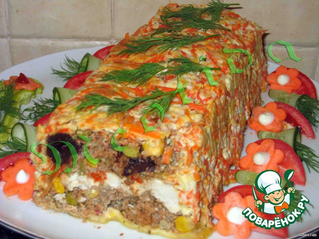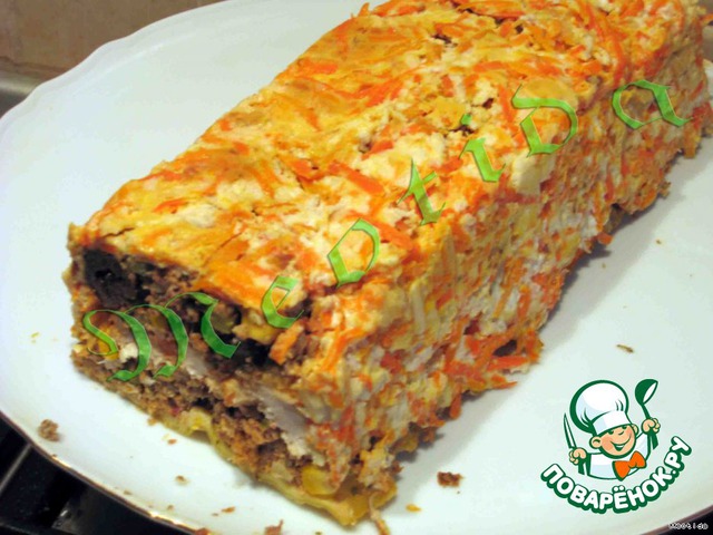 | морковно-сырная корочка.. нежная говядинка (в помидорно-майонезной заправке) с кусочками курочки.. легкие вкрапления горошка и кукурузки.. немного чернослива, замоченного в коньяке... сладкий стручковый перчик... конечно, ароматные специи и пряные травки очень вкусно и в холодном.. и в горячем виде .. как закуска.. и как горячее |