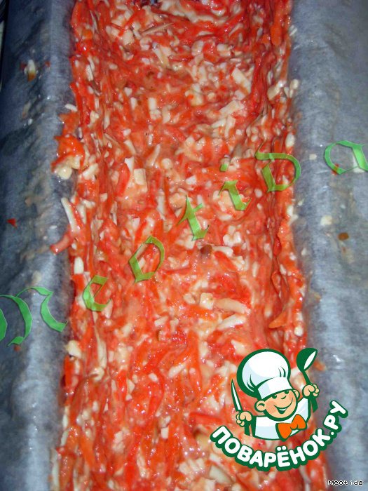 форму (объем 1,5литра) застелить бумагой для выпекания, смазать маслом, выложить дно и бортики равномерным морковно-сырным слоем