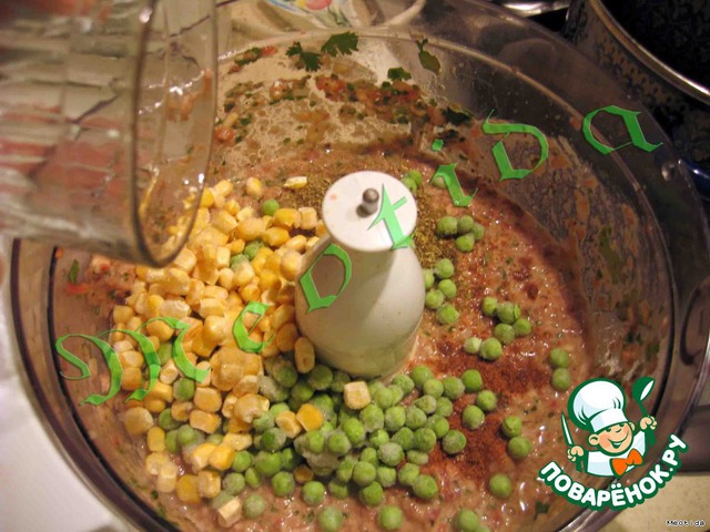 добавить горошек и кукурузу, перемешать ложкой