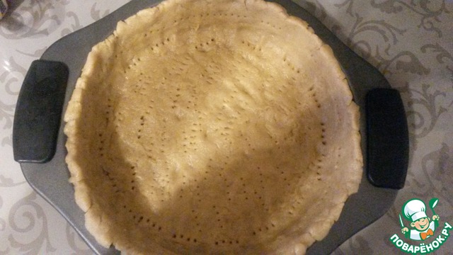 Тесто раскатываем и кладем в форму, плотно прижимая. Накалываем вилкой поверхность.