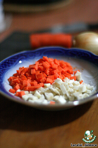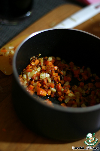 Мелко режем морковь, лук, сельдерей, чеснок.