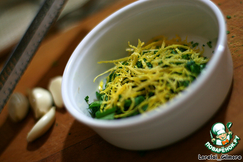 Мелко нарезала петрушку, добавила цедру, натерла чеснок, крупную соль растолкла в ступке. Добавила оливковое масло и все смешала.