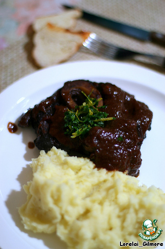 Когда мясо приготовилось, вытащила кусочки, выложила на тарелку. Оставшийся густой соус пюрировала и полила мясо на тарелке.