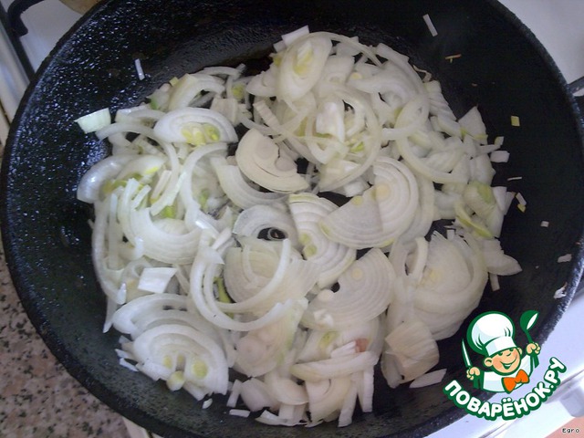 Нарезаем лук полукольцами и обжариваем. Сухари натираем на терке или измельчаем в блендере.