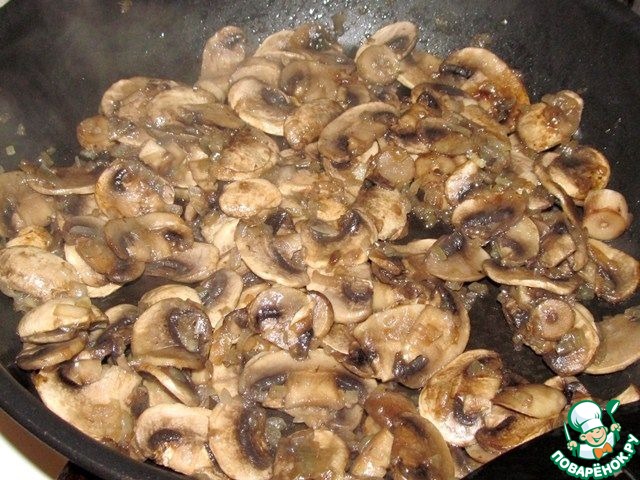 Шампиньоны помыть, почистить, порезать. 1 луковицу почистить, порезать кубиками (я режу полукльцами). на сковороду влить растительное масло, высыпать грибы и лук, посолить, протушить 10 минут под крышкой, 5 минут жарить без крышки.