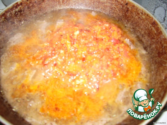 Нашу смесь из помидор, лука, моркови и чеснока добавляем в мясо, накрываем крышкой и тушим минут 5.