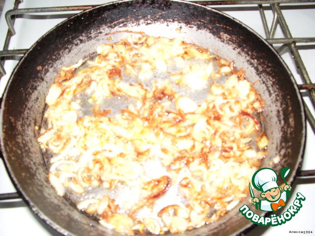 Пока наше мясо тушится, режем лук на полукольца и обжариваем до золотистой корочки на другой сковороде.