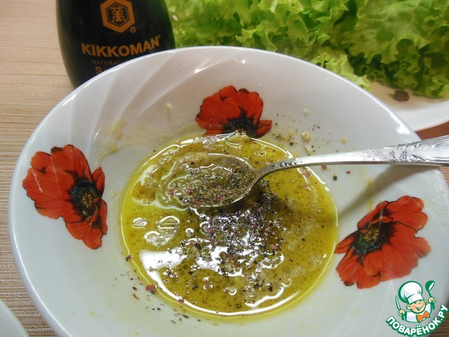 Яблочный уксус, оливковое масло (можно заменить и на подсолнечное), соевый соус, горчицу, чеснок, смесь перцев, всё хорошенько перемешать.