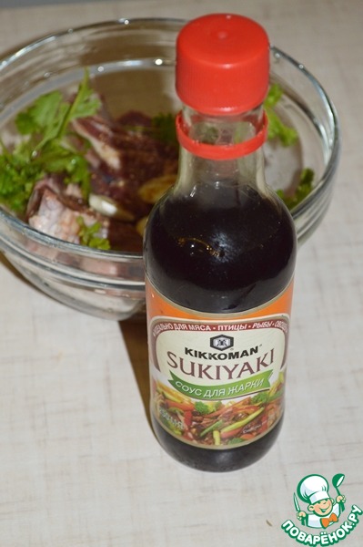 1. Чеснок почистить, нарезать пластинками, кинзу помять руками. В чашке смешать чеснок, кинзу, соевый соус, масло, кориандр и лимонный сок. Добавить мясо, перемешать, накрыть и убрать в холодильник на 1 час.