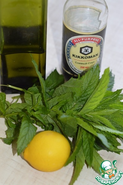 2. Для заправки в чашу блендера поместить листочки мяты, лимонный сок и соевый соус, перец, измельчить. Затем постепенно влить масло.
