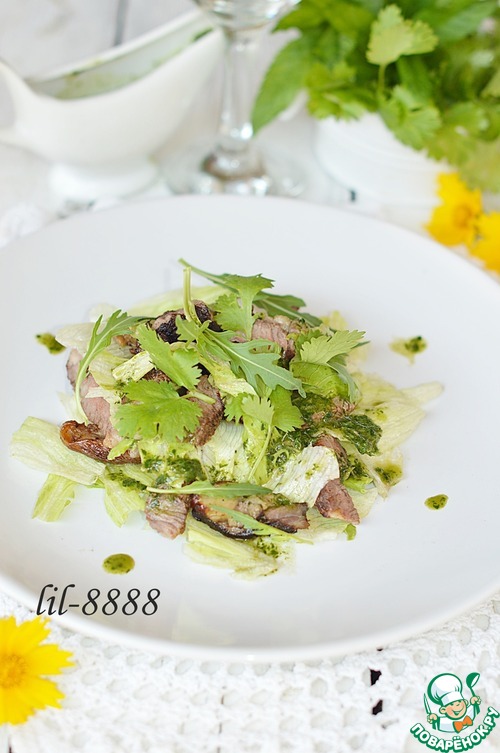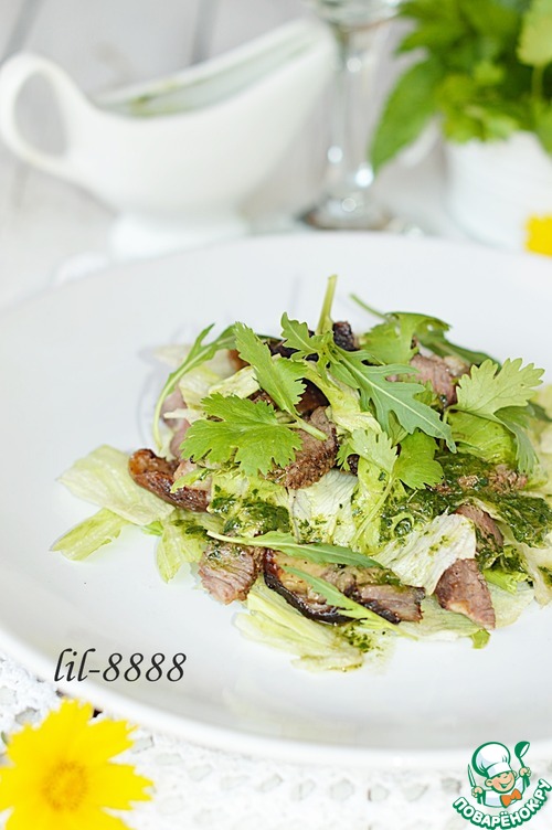 4. Мясо нарезать произвольно. На тарелку выложить салат, мясо и полить заправкой. По желанию подать украсив листочками кинзы.