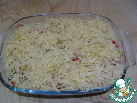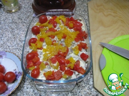 Следующий слой по периметру помидоры черри, а остальную площадь, покрываем подготовленными перцами.