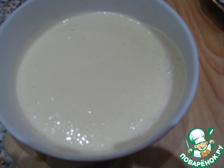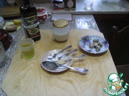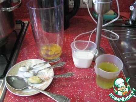 Я приготовила не очень густой майонез, что-бы пропитать все слои, начиная с мясного до первого слоя (картошки). Выход майонеза составил 400г.