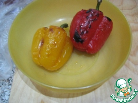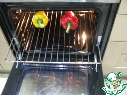 Ставим перцы запекаться в духовку на 220*, на решетку, на 15-20 минут, каждые 5 минут, переворачиваем. Можно запечь как в микроволновке. если есть Гриль, так и на плите, на сухой сковороде с толстым дном.
