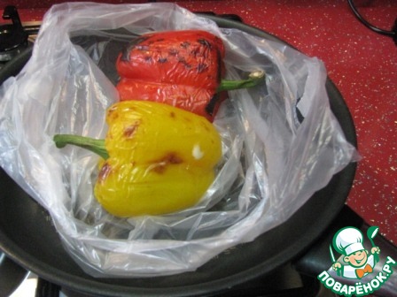 Наши перцы готовы, достаем и перекладываем в целлофановый пакет, завязываем и даем полностью остыть, а сами начинаем формировать слои для будущего салата.