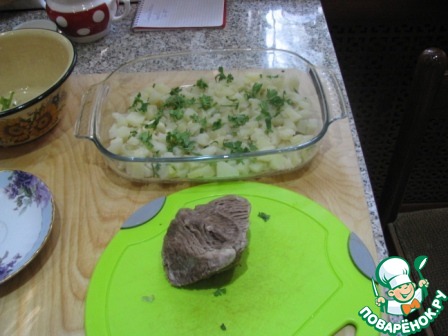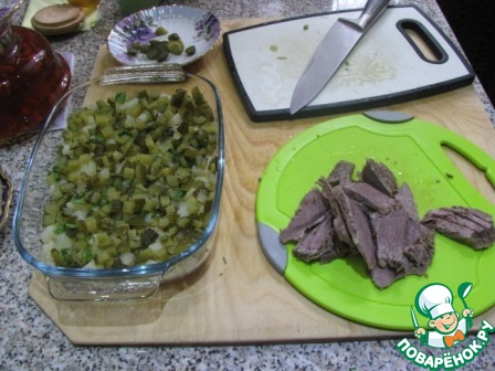 Также кубиками нарезаем нашу говядину. Вот здесь наступила очередь майонеза. Половину порции майонеза распределяем по поверхности мяса, забыла сделать фото.