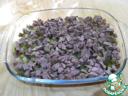 Следующий слой маринованные огурцы (если нет маринованных, используйте плотные соленые, что-бы не было лишней жидкости), режем так-же аккуратными, не большими кубиками.