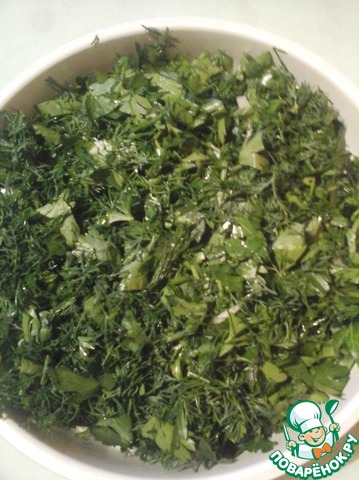 Сверху распределяем мелко нарезанные укроп и петрушку.