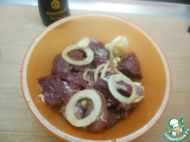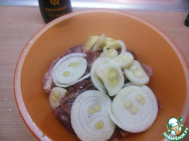 Мясо посолили, посыпали чёрным перцем, залили соевый соус. Всё хорошо перемешали, каждый кусочек промассажировали...