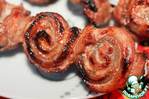 Нанизываем на шампура. И жарим на мангале, по времени это занимает не более 20 минут.