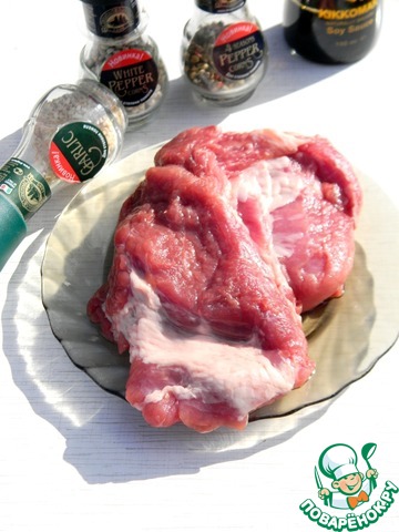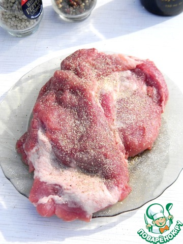 Для приготовления мяса одним куском лучше всего брать шейную часть свинины, она с прожилками, такое мясо трудно пересушить. Мой кусочек был немного толстоват, я постучала его молоточком, тем самым немного расплющила.