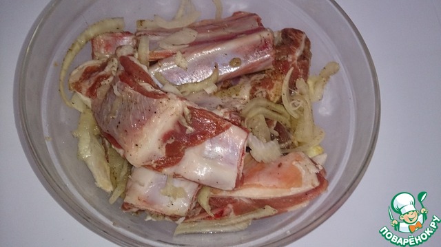 Баранину нарезать на порционные куски, промыть под холодной водой. Выложить в глубокую посуду. Лук нарезать полукольцами, хорошо размять руками, добавить к мясу. Добавить специи, по желанию ( я добавляла перец и молотый имбирь)
