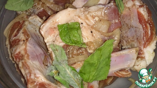 Тщательно перемешать мясо. Добавить к мясу несколько листочков мяты. Оставить мясо мариноваться хотя-бы на пару часов!