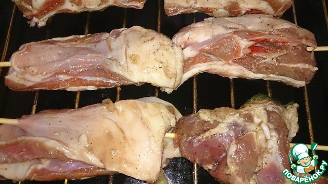 Обжарить на углях, или в духовке. У меня ушло 30 минут, при 220-240 гр. (Ориентироваться следует по своей духовке) В процессе приготовления мяса, можно полить его маринадом.