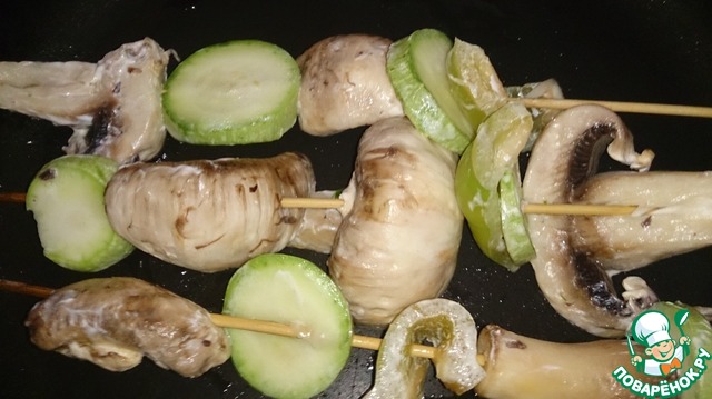 Овощи помыть почистить, порезать. Сбрызнуть растительным маслом, и соевым соусом, оставить на 5-10 минут. Затем добавить к овощам майонез и оставить на 25-30 минут. Нанизать на шпажки и обжарить на сковороде минут 5-7.
