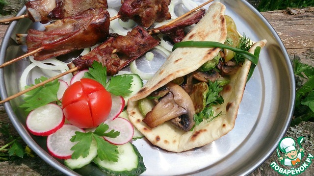 Готовые шашлыки выложить на блюдо, подавать с овощами. Приятного аппетита!))