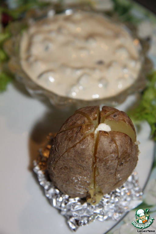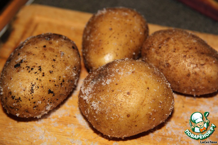 Печеный картофель разрежем на несколько долек, добавить в середину кусочек сливочного масла.