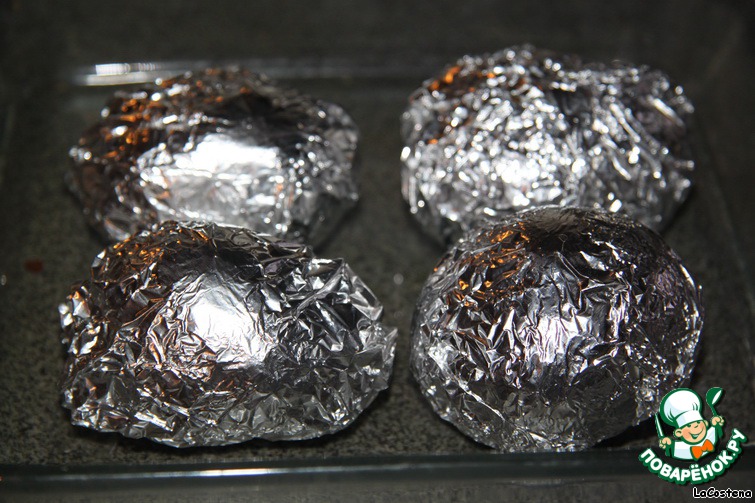 Завернем мясо в фольгу и поставим в духовку на 20 минут. Картофель из духовки не вынимаем, переставляем его на нижнюю полку.