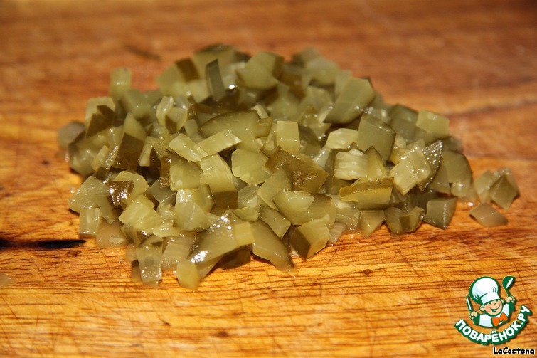 Сделаем соус для картофеля. Нарежем соленый огурец очень мелко.