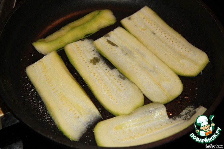 Кабачки нарезать полосками и обжарить на оливковом масле с 2-х сторон.