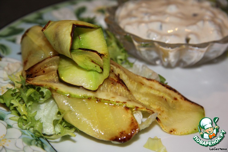 Выложим соус для картофеля, смесь салатов и кабачки на тарелку.
