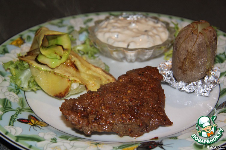 | В этом блюде соединились: печеный картофель, говядина в маринаде и овощи. |