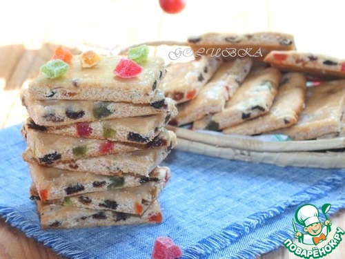 | Медовое печенье «Лекерли» - leckerli - переводится как лакомое печенье. Тесто для «Лекерли» готовится из обычной муки, и в него добавляются пряности, а так же орехи, сухофрукты и цукаты. Поверхность готовых «Лекерли» покрывается глазурью из кирша (вишневой водки, если нет импровизируйте - у меня ром). Я добавила еще лимонный сок. |