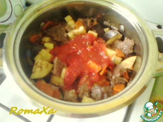 Добавляем томатную пасту и оставляем на маленьком огне ещё, буквально, на 5 минут.