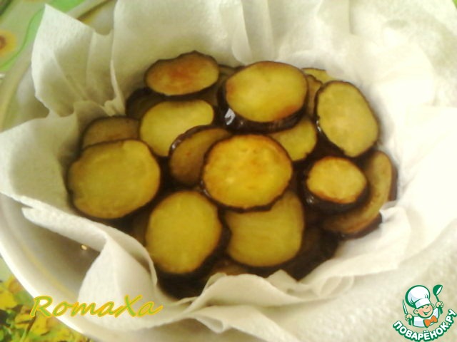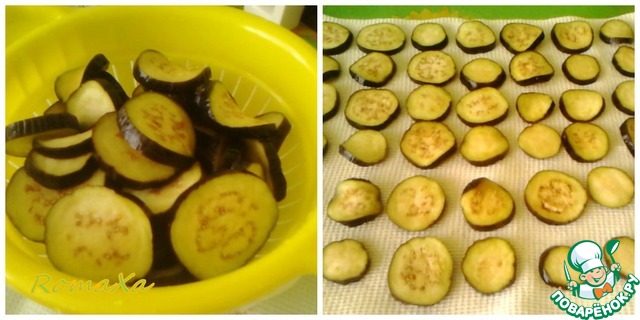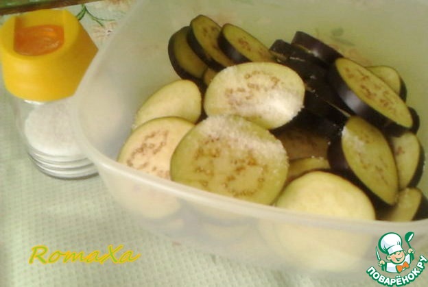 Баклажаны моем, отрезаем "хвосты", нарезаем кружками толщиной 1 см. Складываем в удобную для вас посуду, солим, перемешиваем и оставляем на 15-20 минут