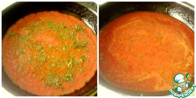 В это время подготавливаем томатный соус: помидоры, чеснок и смесь перцев измельчаем в блендере. Затем в сковороду наливаем 50 г оливкового масла, вливаем соус, добавляем порубленную зелень (я добавил петрушку), перемешиваем и доводим до кипения