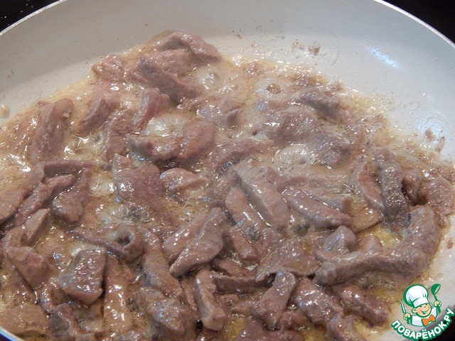 Говядину нарезаем тонкими брусочками и обжариваем в кипящем масле 3-4 минуты.