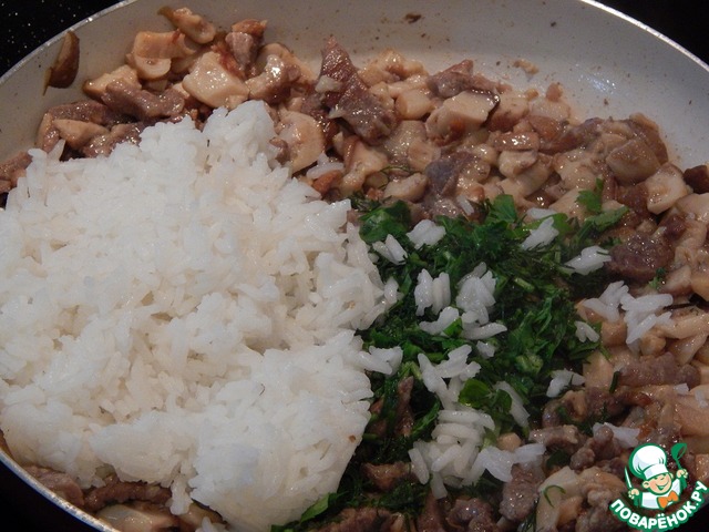 К обжаренным грибам и мясу добавляем сварившийся рис и зелень. Остужаем, добавляем любимые специи, соль.