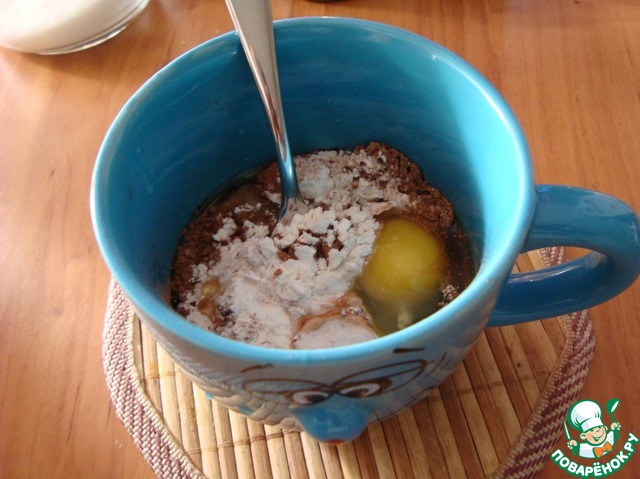 Вилкой в чашке последовательно смешать: яйцо, сахар, муку и разрыхлитель, растительное масло, молоко до получения жидкого теста