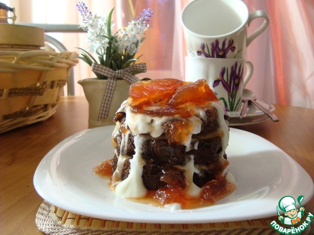 Украшаем бисквит тем, что есть на данный момент в холодильнике. У меня нашлось варенье яблочно-лимонное и йогурт белый. Промазываем каждую часть йогуртом и вареньем.