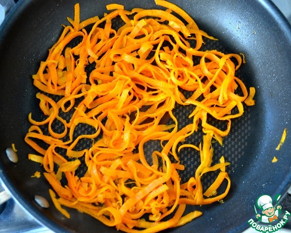Подготовить первым делом овощи. Морковь очистить, вымыть, высушить и нарезать нитями (получается почти как нарезка жульен, только еще длинее). Цуккини также вымыть, но не снимать кожуру. Обрезать края и также натереть его нитями...