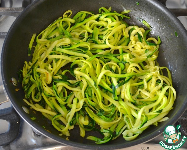 В сковороду выложить цуккини. Осторожно помешивая, подержать на огне пару минут, но не солить и не добавлять сахара, иначе цуккини пустят воду.