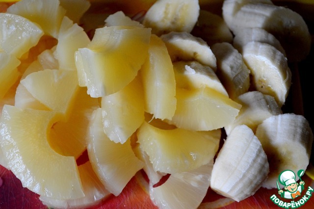 В блендере взбиваем фрукты и хлопья, затем добавляем сок из банки от ананаса и сок красного апельсина.