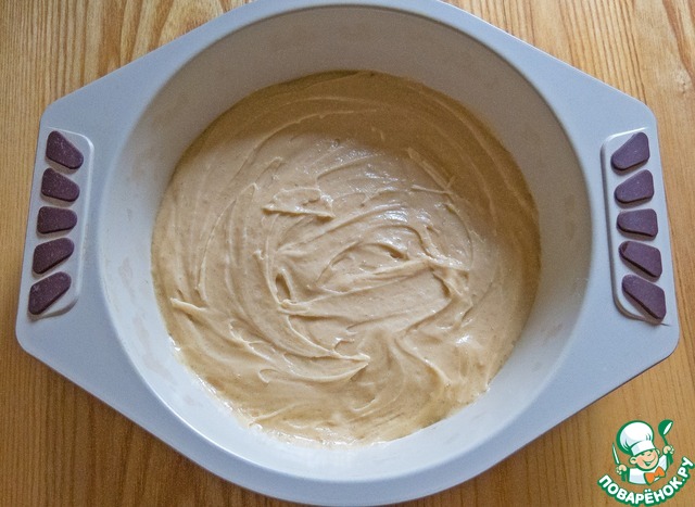 Муку смешиваем с разрыхлителем, просеиваем и вмешиваем в тесто. Оно должно получится довольно густым. Форму (22 см.) смазываем растительным маслом и выкладываем в нее тесто. Разравниваем ложкой. Отправляем в разогретую на 180 градусов духовку на 20-25 мин.