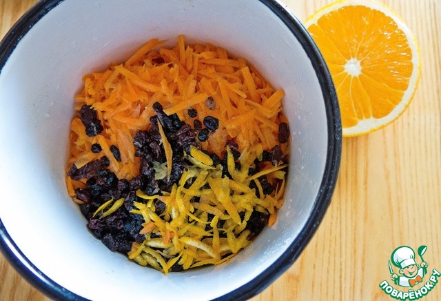 Пока корж остывает, можно заняться приготовлением мюсли. Натертую морковь, чистый изюм, цедру и сок апельсина ставим на огонь. После того, как масса закипит, делаем маленький огонь, накрываем крышкой и варим 20 мин.